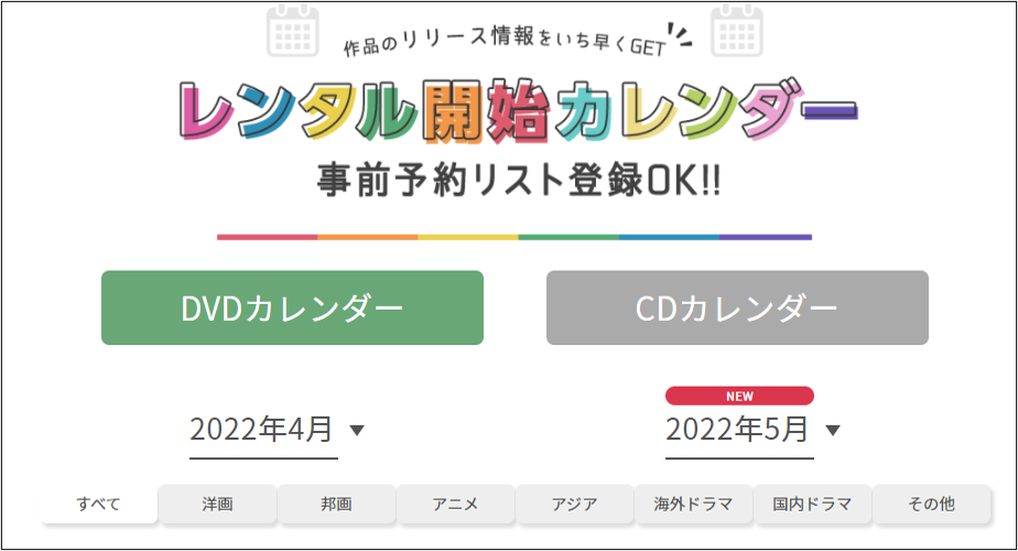 これからレンタルが開始される作品は「レンタル開始カレンダー」で確認できます。