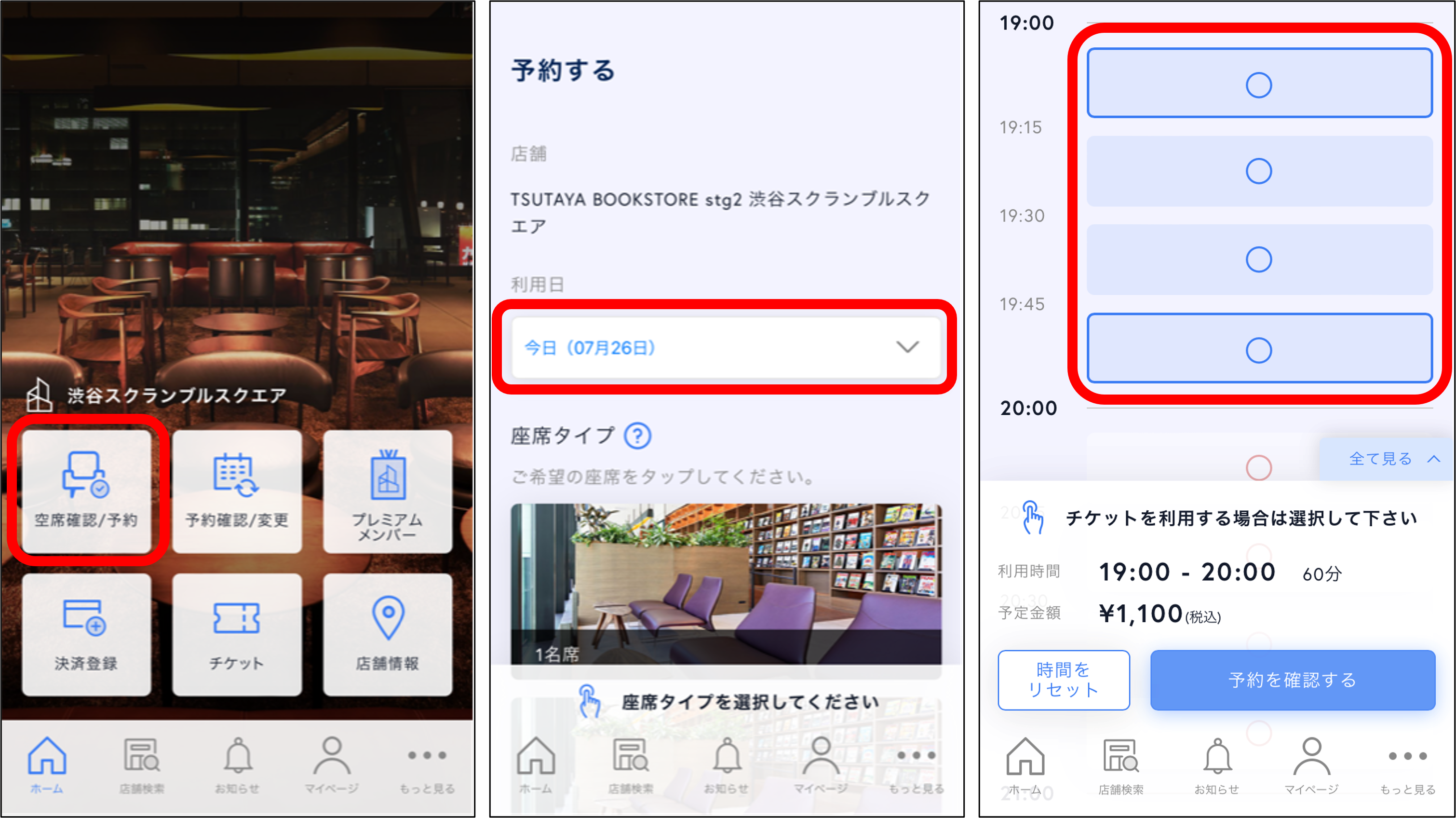 店舗、利用日、座席タイプ、利用人数、開始・終了時間を選択して予約登録します。