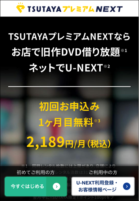 ※旧プラン「TSUTAYAプレミアム」の受付は、2023年6月14日をもちまして受付終了となっております。 旧プラン会員様で、付帯サービス「U-NEXT」ご希望の場合は、新プラン「TSUTAYAプレミアムNEXT」をご検討ください。詳細については、こちらこちら